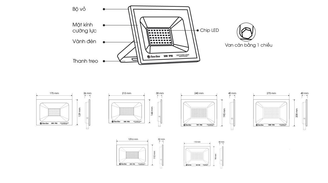 Cấu tạo và kích thước của đèn pha LED CP10 Rạng Đông