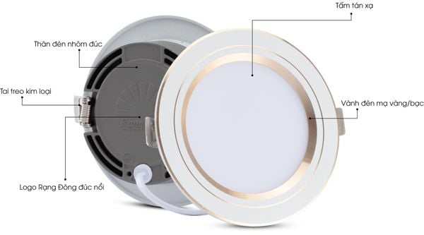 Thân đèn mỏng, viền trang trí kim loại tinh tế phù hợp các phong cách nội thất từ hiện đại đến sang trọng; khi lắp gần như phẳng mặt trần, cực kỳ thẩm mỹ.