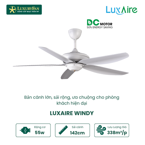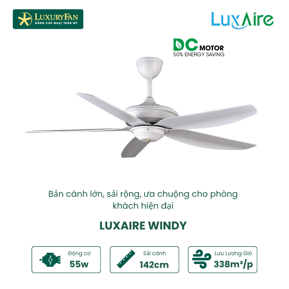 Mẫu quạt mạnh mẽ, gió tốt, giá tốt cho nhà phố. Quạt trần năm cánh nhựa ABS cao cấp, sải cánh dài 142cm phù hợp cho các không gian phòng khách. Trang bị động cơ DC Motor 55W giúp tiết kiệm điện, tích hợp điều khiển từ xa là chế độ đảo quay của quạt, hẹn giờ, gió tự nhiên..